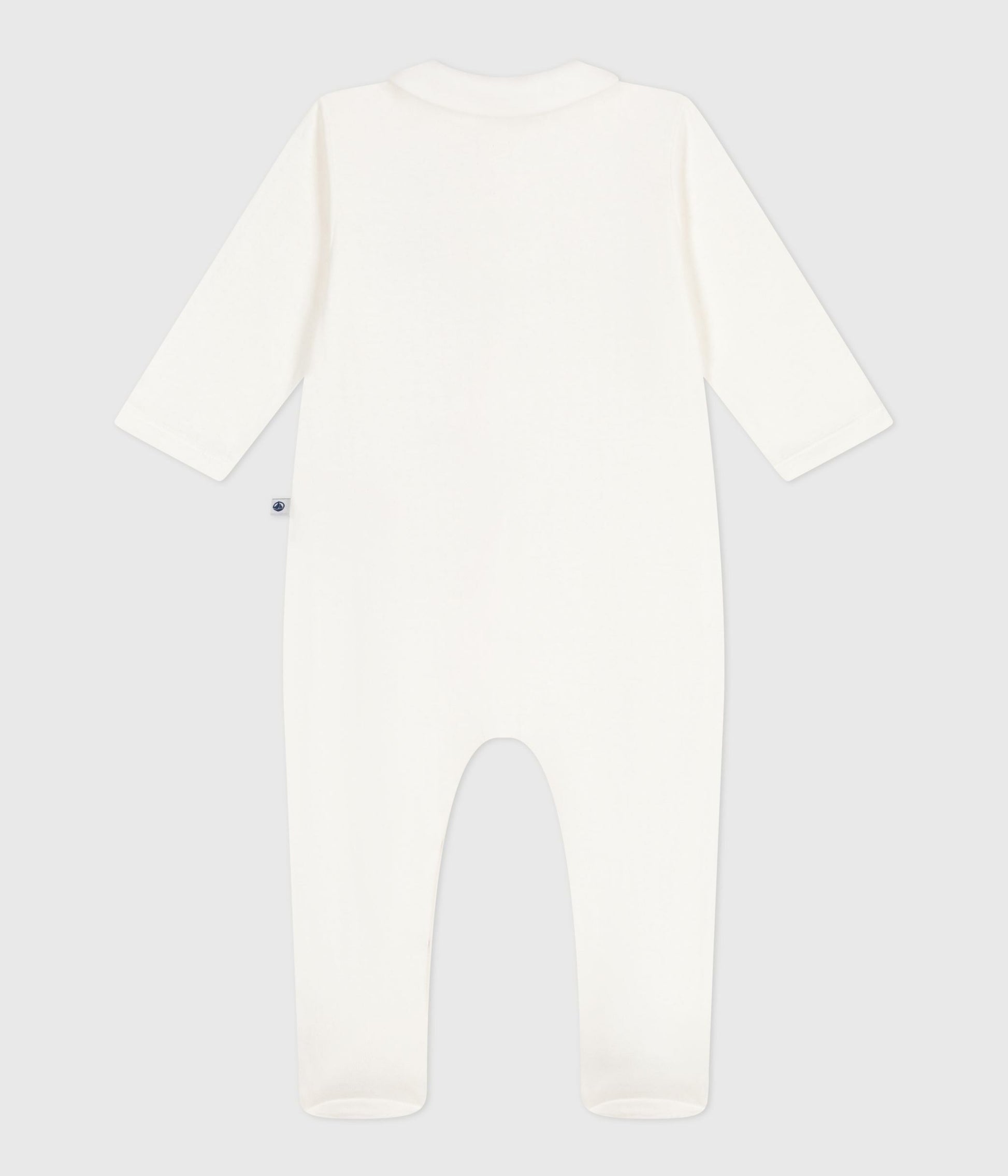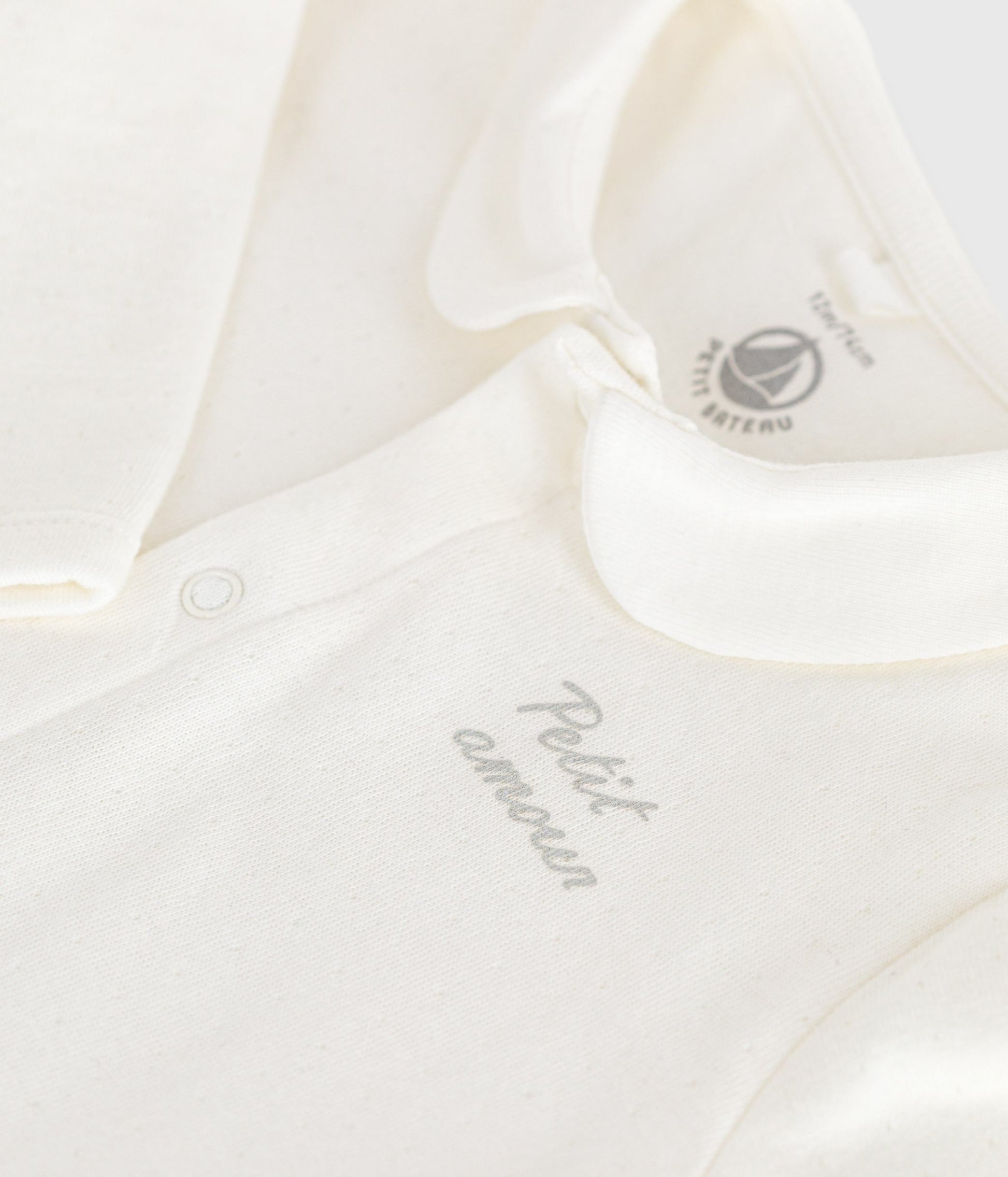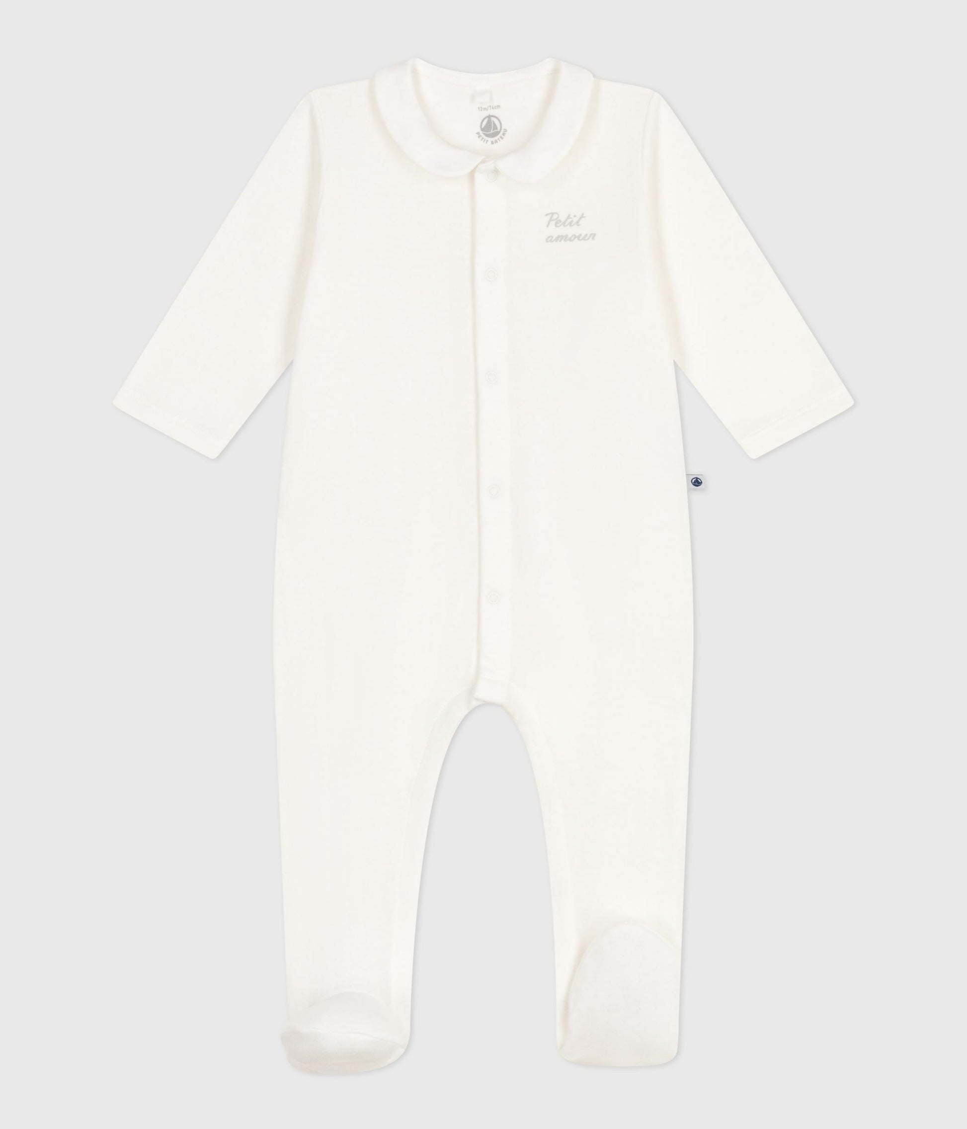 Babies' unisex tube-knit sleepsuit The pyjama suit is opened and fastened with poppers at the front and between the legs. Tube knit is one of Petit Bateau's iconic fabrics: two extremely soft knits linked together for a unique, snuggly feel. Pretty little love screen print on the chest Item: 100%Cotton Ref. No. A0CLB01480