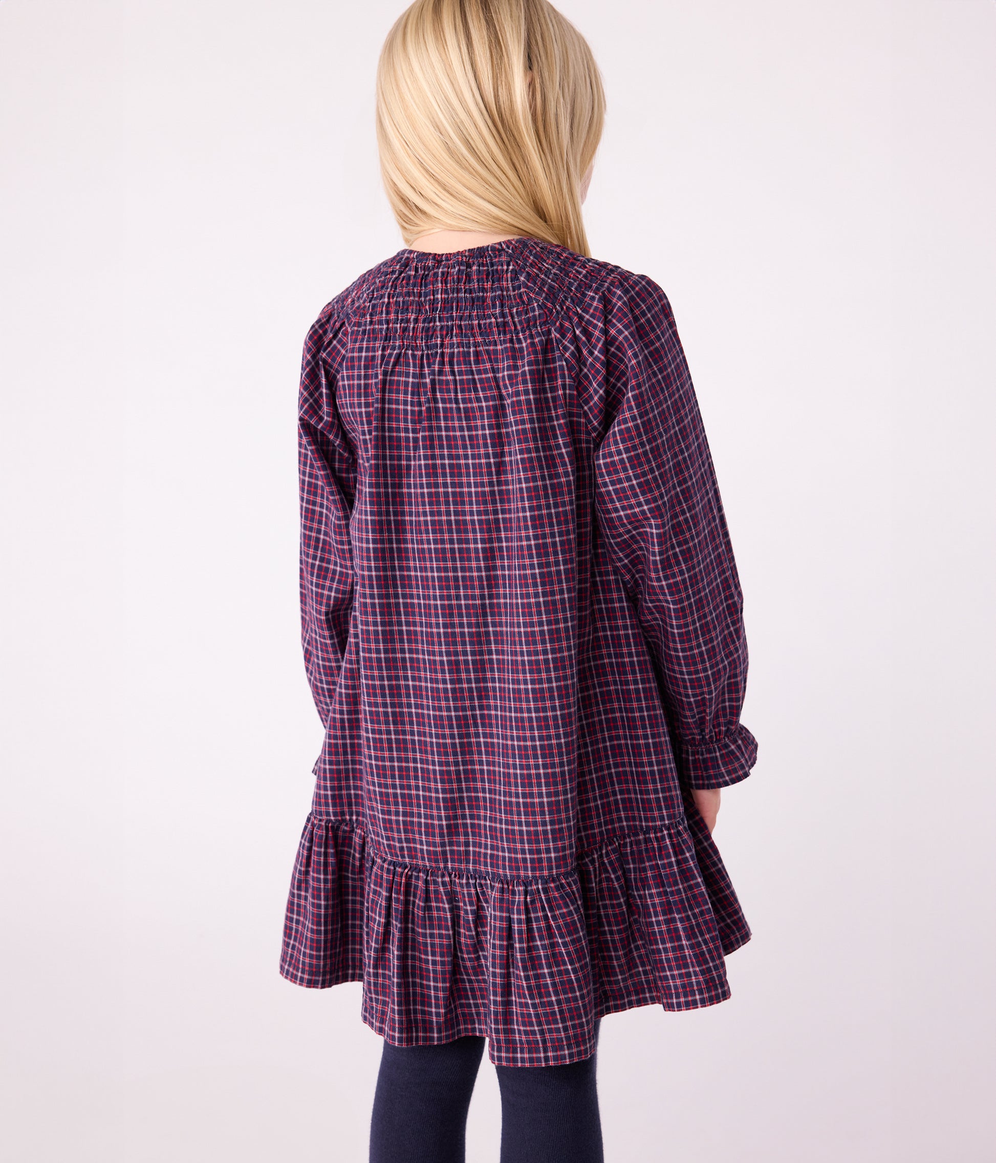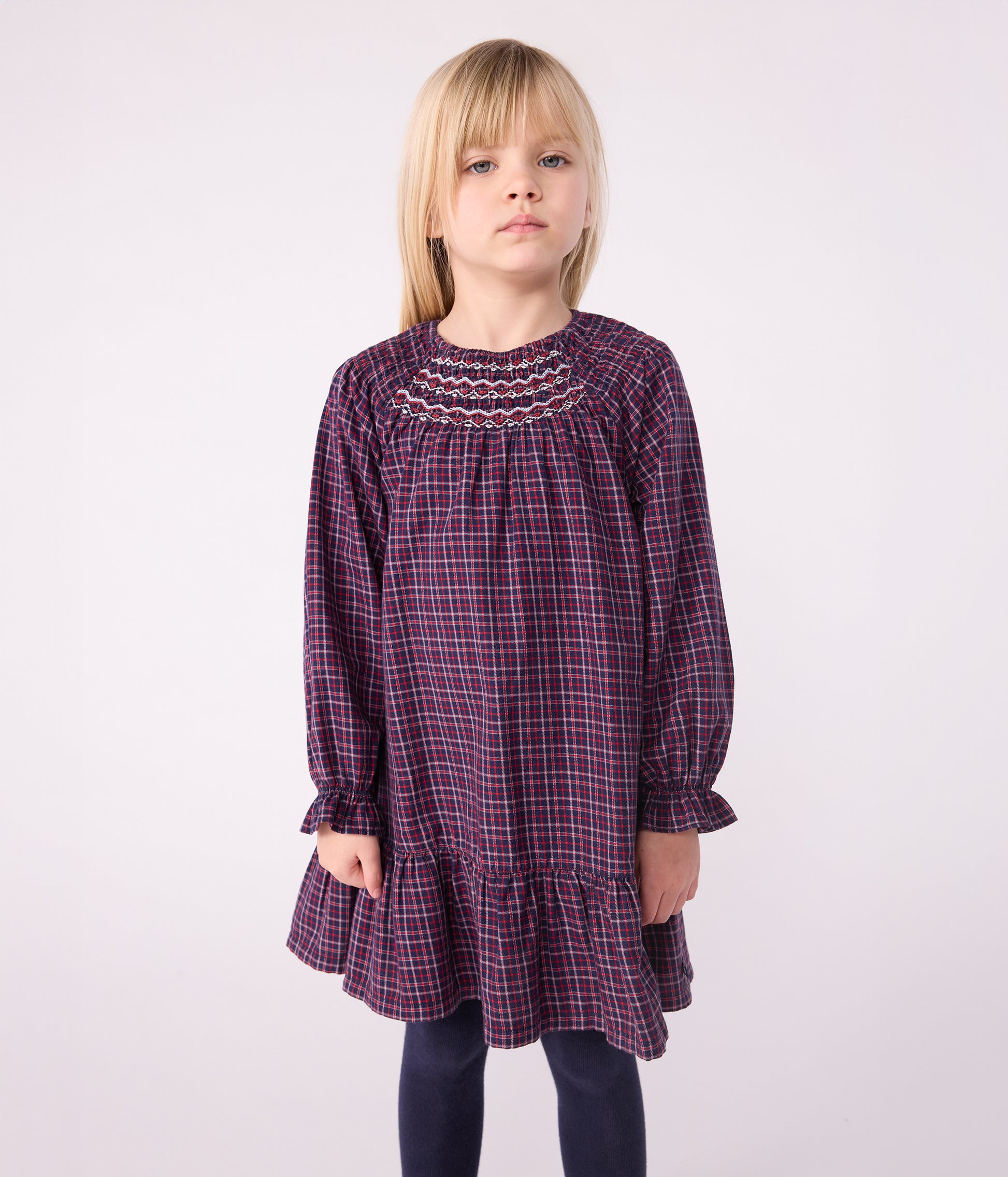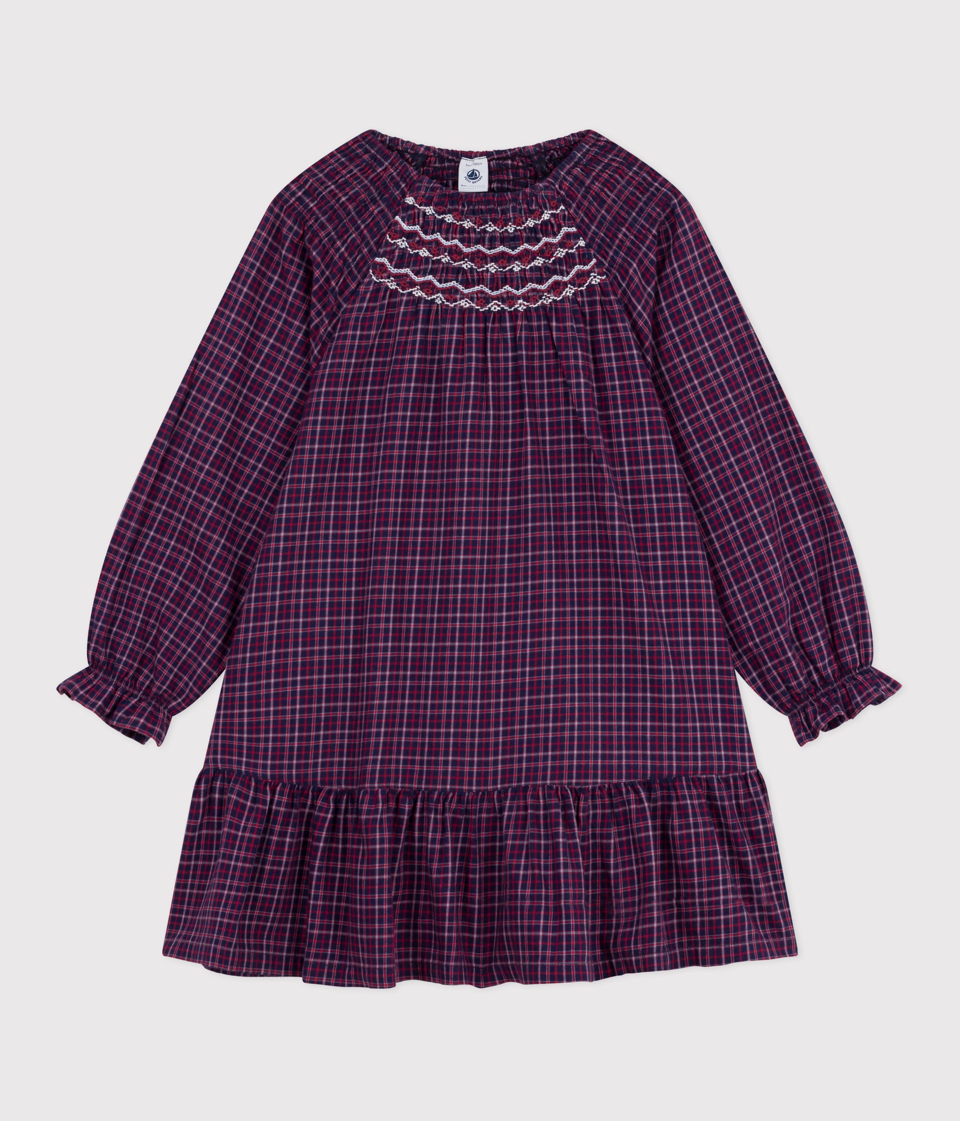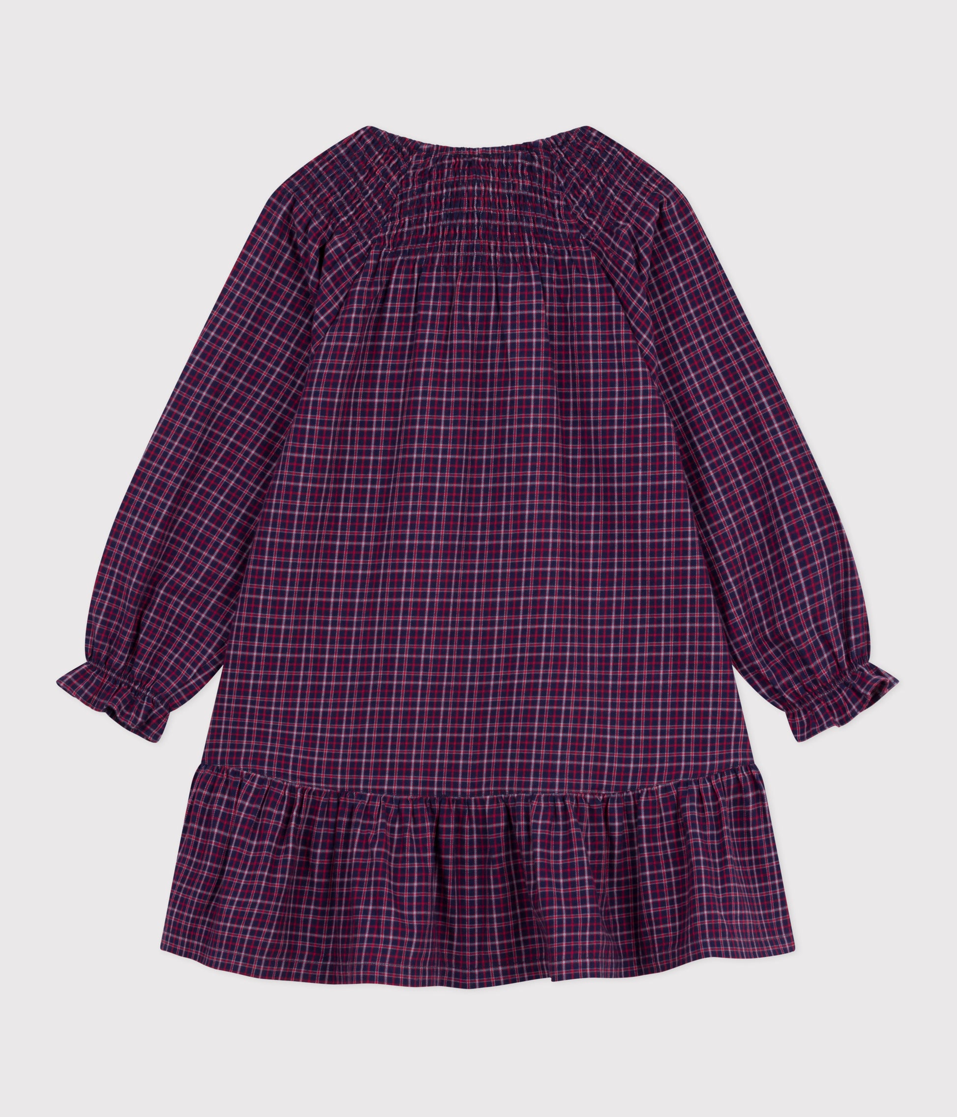 Girl's dress in flannel, a soft, comfortable fabric ideal for winter. Loosely cut and flared. Round neckline with embroidered smocking. Loose sleeves with smocked cuffs. Item: 100%Cotton Ref. No. A0DYZ02050