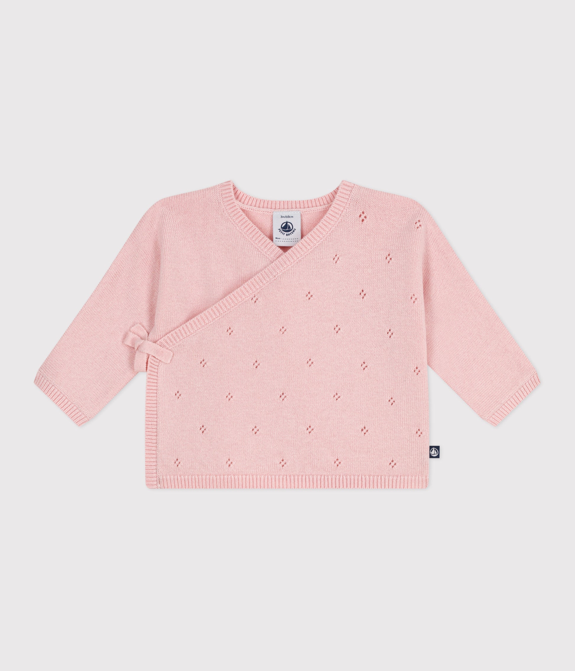 A wrapover cardigan in an openwork knit containing wool, comfy and warm for the winter. So stylish with its pretty stitch pattern and ties attached on the side. Available in 2 colours. We have knitted this garment using high-quality wool that respects animal welfare. Item: 55%Wool 45%Cotton Ref. No. A0EC201000
