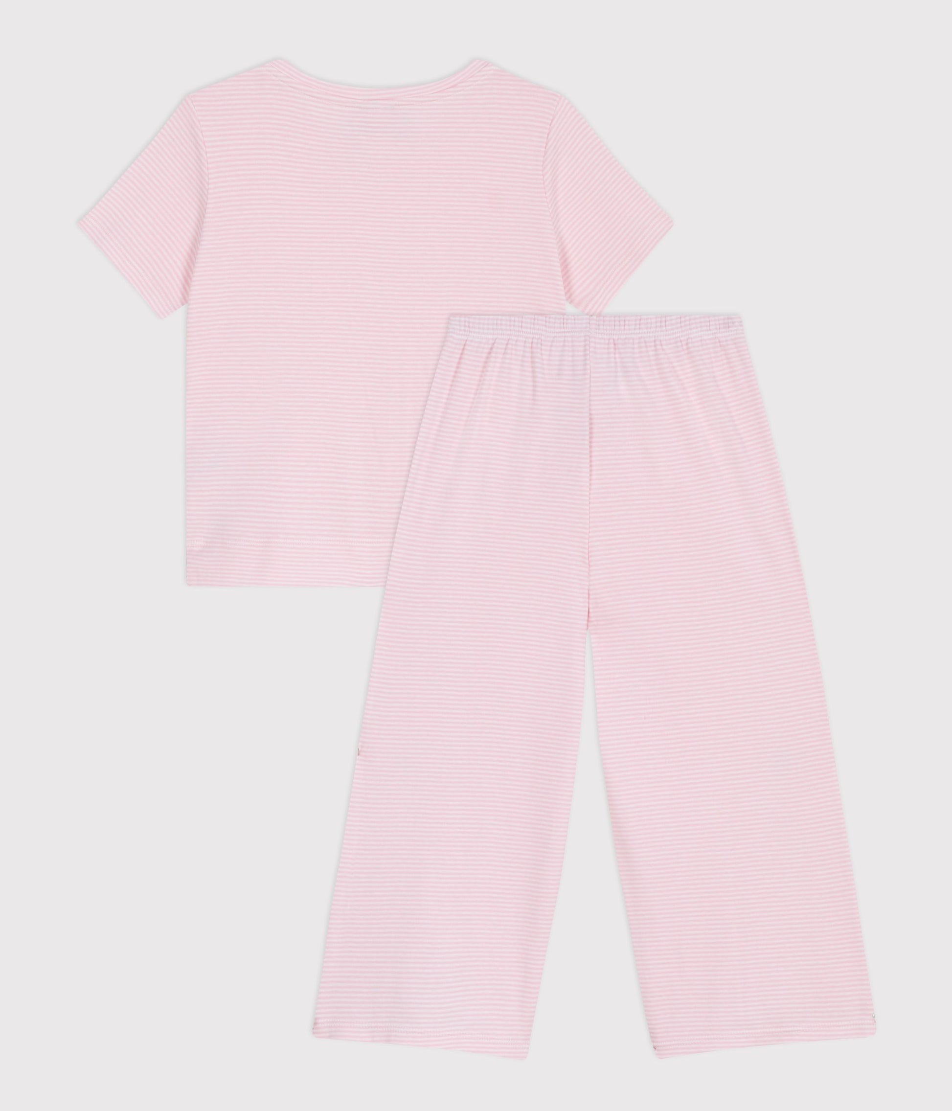 Girls' pyjamas in pinstriped 1X1 rib knit, a stretchy, comfortable fabric. Short-sleeved, loose T-shirt top with small slits on the sides. The wide-leg pyjama trousers are extra comfortable. Elasticated waistband. Organically grown cotton, guaranteeing more eco-friendly farming practices and zero GMOs. Item: 100%Cotton REF. NO. A0F6I01040