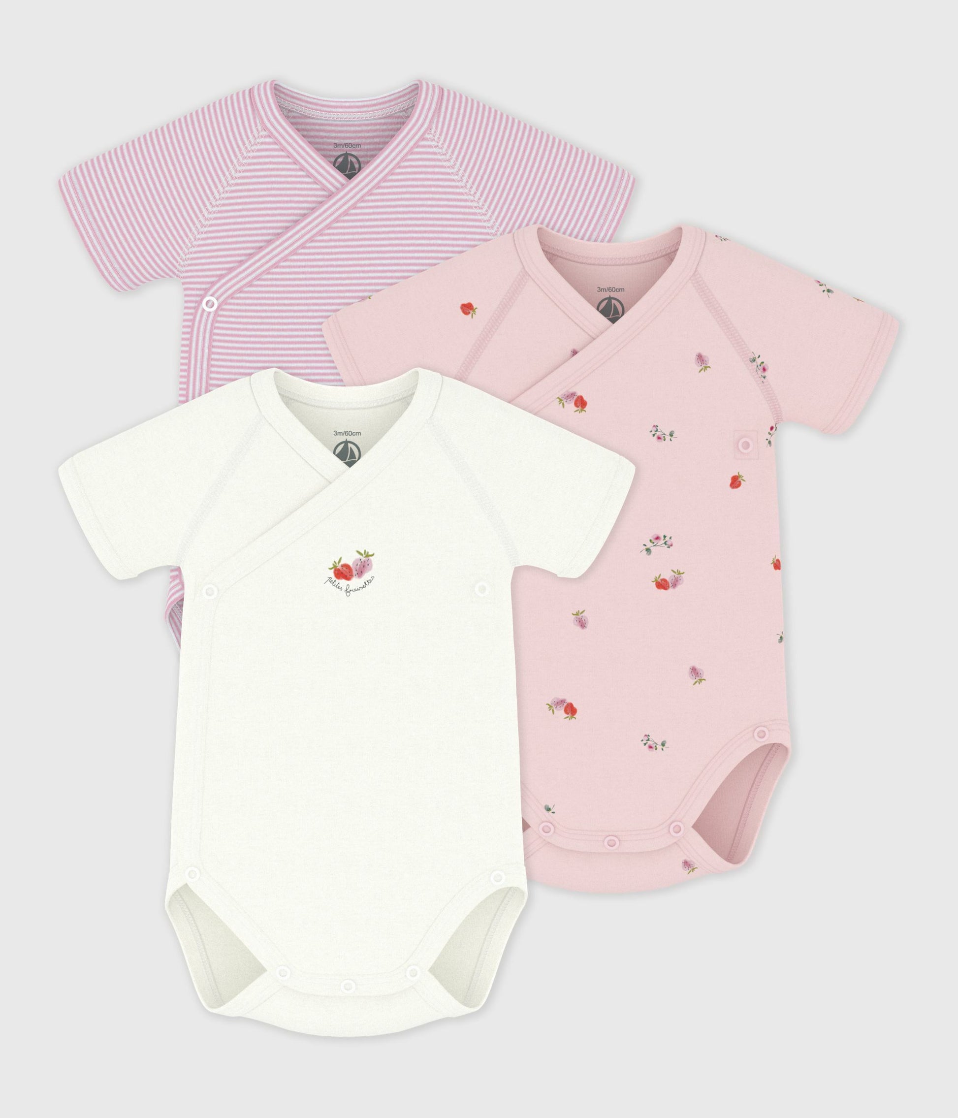 Pack of 3 short-sleeved unisex wrapover bodies in 1X1 rib knit, a comfy, stretchy fabric. This pack includes one printed body, one plain body and one pinstriped body. Wrapover bodysuits are perfect for newborns as the wide opening stops you from having to wrestle your baby in and out to change them. They are fastened with poppers on the front and between the legs. Organically grown cotton, guaranteeing more eco-friendly farming practices and zero GMOs. Item 1: 100%Cotton