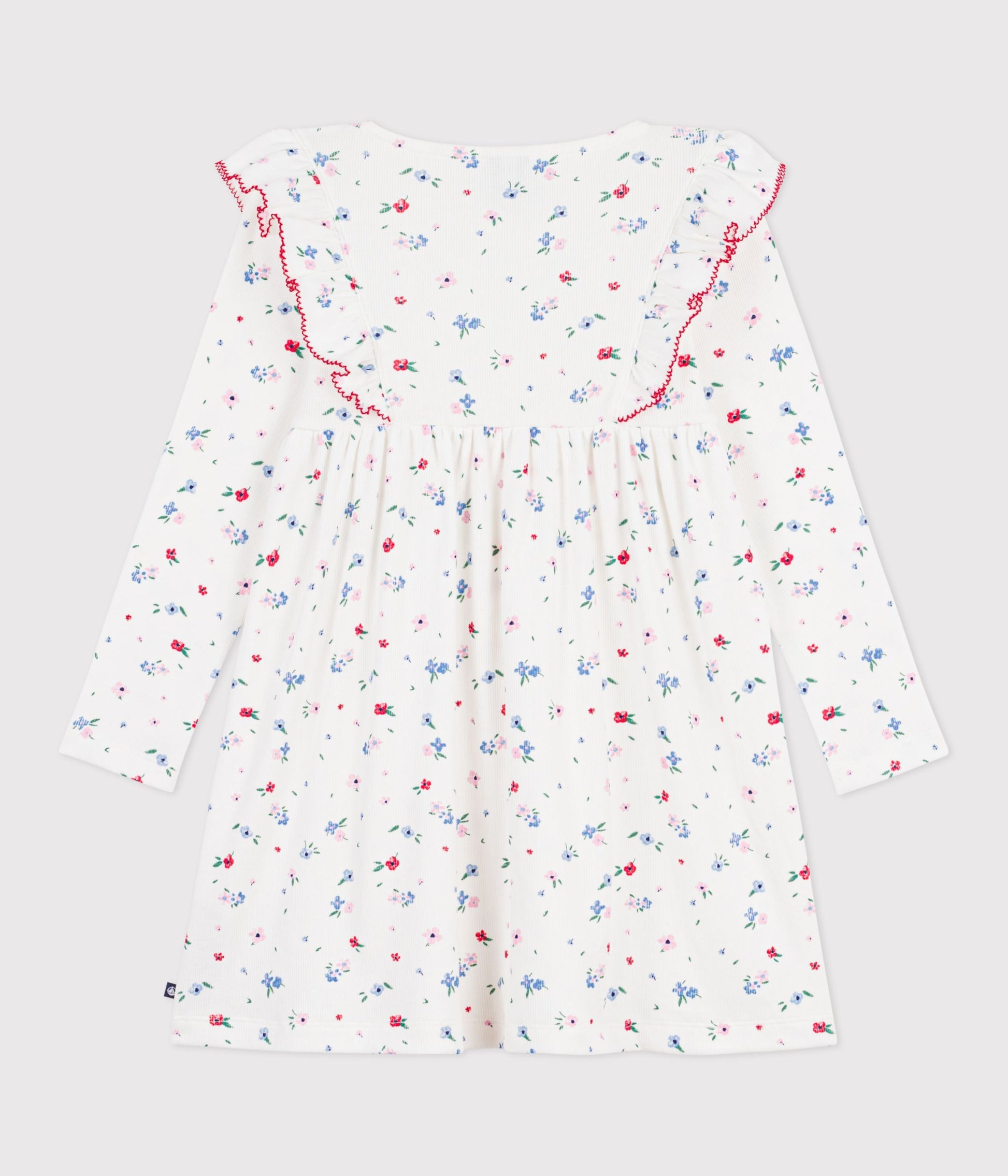 Girl's dress in 2x2 rib knit, a soft, stretchy fabric with a slightly ribbed appearance. Flared cut. Round neckline, gathered waist and small ruffles at the armholes. It's fitted at the waist, and the charming gathering gives it a feminine look. Organically grown cotton, guaranteeing more eco-friendly farming practices and zero GMOs. Item: 100%Cotton REF. NO. A0FME01050