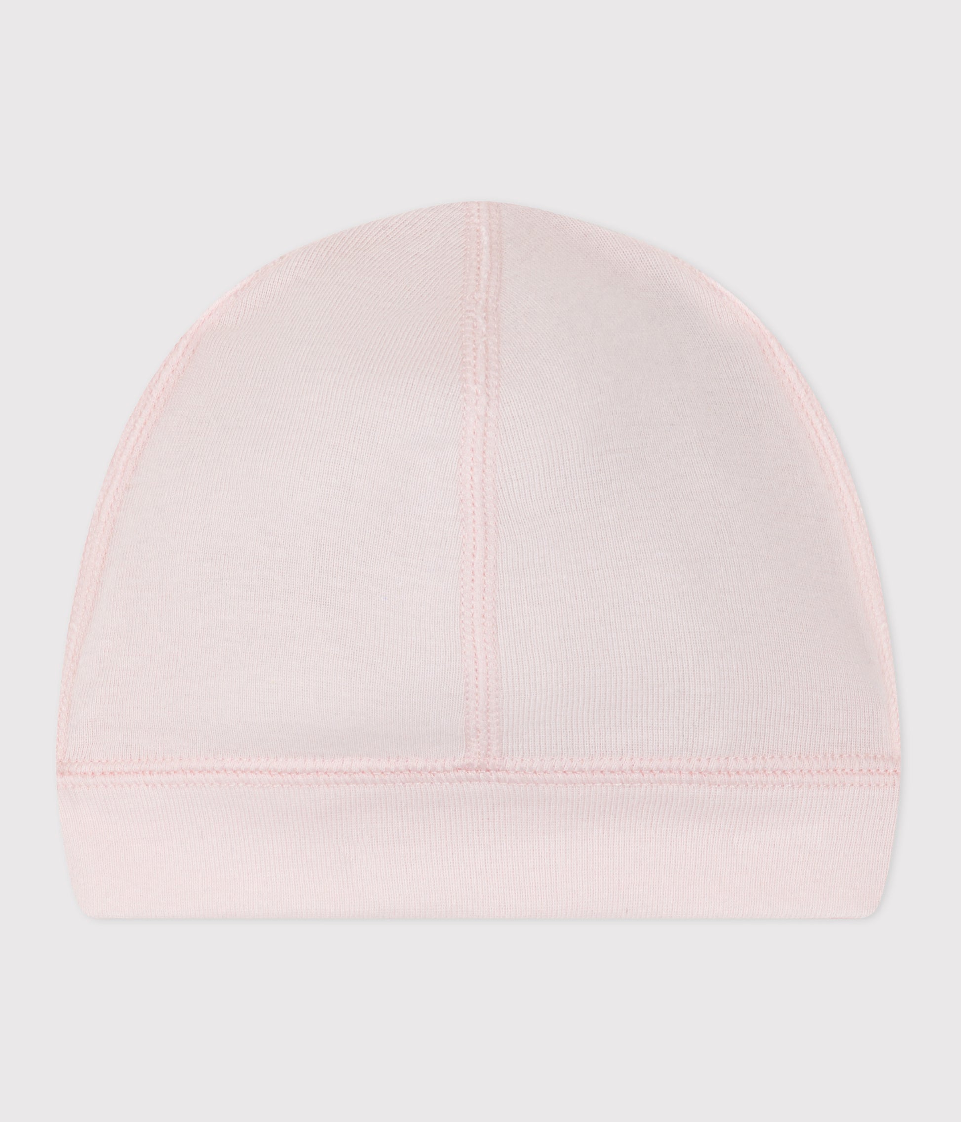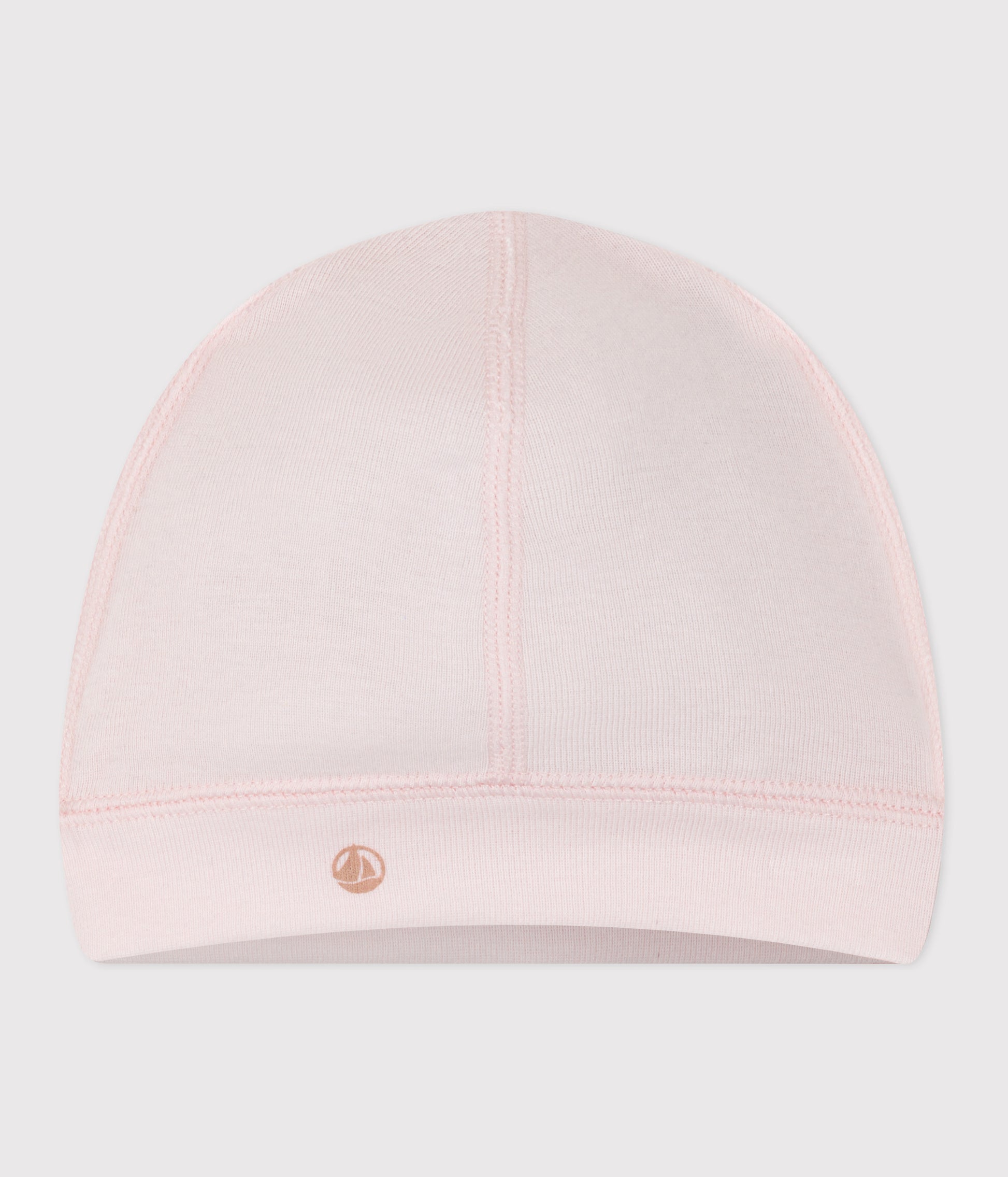 Ensfarvet hue i 1x1 ribstrikket bomuld – et strækbart og behageligt materiale.